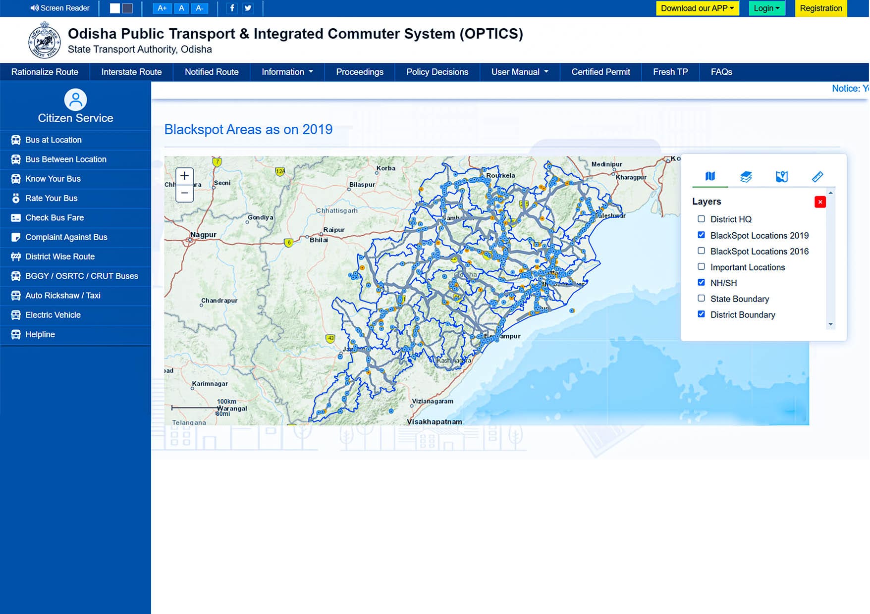 Provisioning of an efficient Transport System is the key to economic development. In the heart of the rural landscape lies an opportunity to transform lives through an efficient and inclusive public transport system. With the background of expertise in geospatial technologies, SPARC has been entrusted with development of the Public Transport permit management system for all the intra-state and inter-state bus counting to about 10,000 in numbers. Our partnership with the Odisha State Transport Authority marked the beginning of a transformative journey aimed at bringing efficiency, reliability and transparency to the existing public transport system through state-wide implementation of a Web GIS based Stage Carriage Permit Management System.